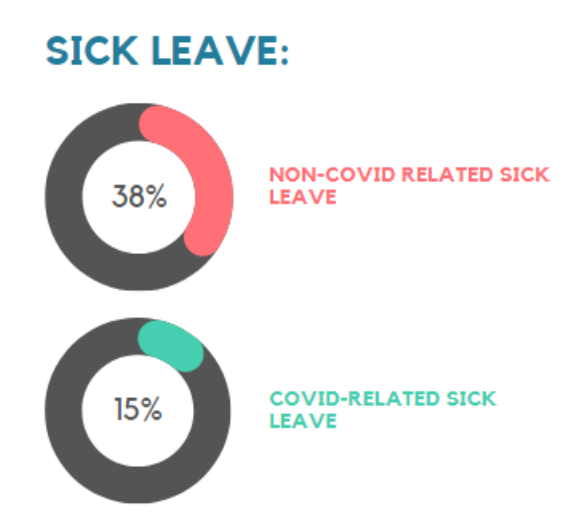 In total, 15% of staff reported taking leave due to COVID-19-related reasons and 38% of staff reported taking leave due to non-COVID-19 illness reasons.