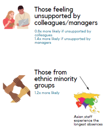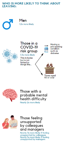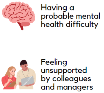 There were some shared risk factors which related to both thinking about leaving the NHS and taking sick leave (both COVID-19 and non-COVID-19 related). These traits include having a probable mental health difficulty and feeling unsupported by colleagues and managers (see Figures 4, 5 and 6).