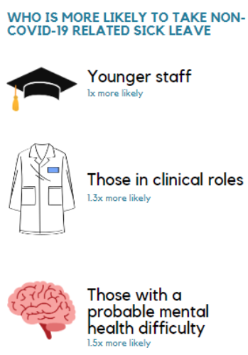 In this study we aimed to identify whether factors such as gender, age, mental health problems, and type of job role influenced NHS staff absences due to illness and their intentions to leave their jobs one year later (May 2021-February 2022).